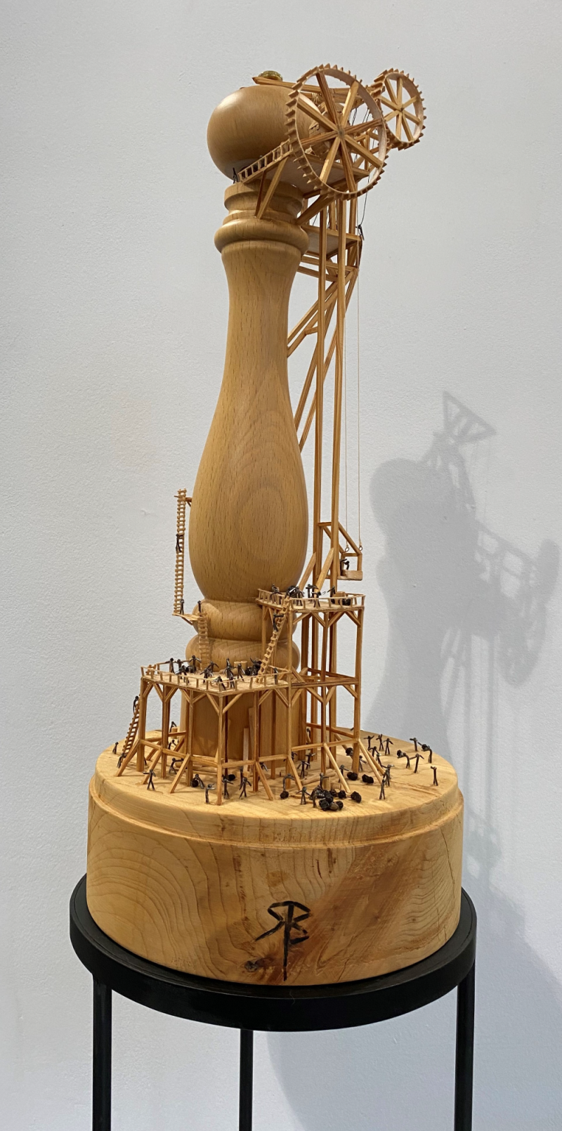 In his work, Rob Buelens (Londerzeel, 1989) reflects on human nature. His wondrous, refined scale models and sculptures explore typical human desires, fixations, and group dynamics. His work has a strong connection with the paintings of Flemish and Dutch masters like Jeroen Bosch and Bruegel, but is also affiliated with classic literary works such as ‘Gulliver’s Travels’ and ‘Utopia’. In these classical oeuvres, metaphors and persiflage are employed to reflect critically on the maker’s contemporary society. In a similar way, the poetic images of Buelens encourage the viewer to think about his or her own nature. By recontextualizing objects including weapons, sugar cubes and coffee mugs, the meaning of the works becomes ambiguous. In this way, Buelens creates room for introspection. Because the scale models are made on a very small scale, the viewer has an all-seeing, almost godlike perspective on the reality represented. The miniscule human figures that inhabit the scale models have no personal characteristics, making them recognizable only as part of a crowd, working together on a shared project. Without a readily identifiable situation or person as a focal point, the viewer is confronted with mankind as actors on their own stage.