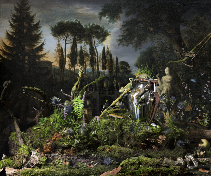 About his work method, he explains: “I come up with an idea and then go looking for the right location, the models and the styling, and while I combine them to make the final image, I am still open to change, improvement and new ideas. Yes, it is staged photography. But even for me, there are always surprises in my work, an element of the unexpected. After the shooting, I then work like a painter, carefully layering the images, creating the final image in my mind and on my computer. It can take weeks before a picture is finally completed.”. This can clearly be seen in the series ‘Withoos meets Withoos’, in which Hans Withoos is inspired by the paintings of his ancestor, 17th century artist Mathias Withoos. He uses them as a background for his own images, seamlessly combining past and present to a new artwork in which two artists meet.