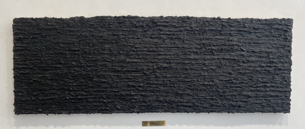 Om te beginnen bij het begin - zwarte kiezels, stalen sokkel, 144 x 24 x 24 cm, 2024, € 9.500,- ( incl. 9% BTW )