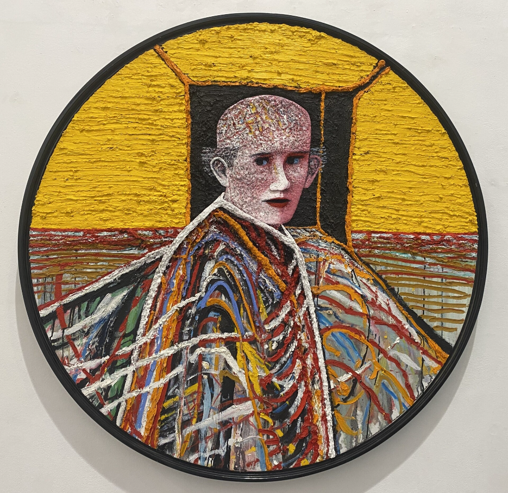 Portret van de zon - olieverf en verfresten op paneel; Ø120 cm x 4 cm; 2024, € 5.600,- ( incl. 9% BTW )