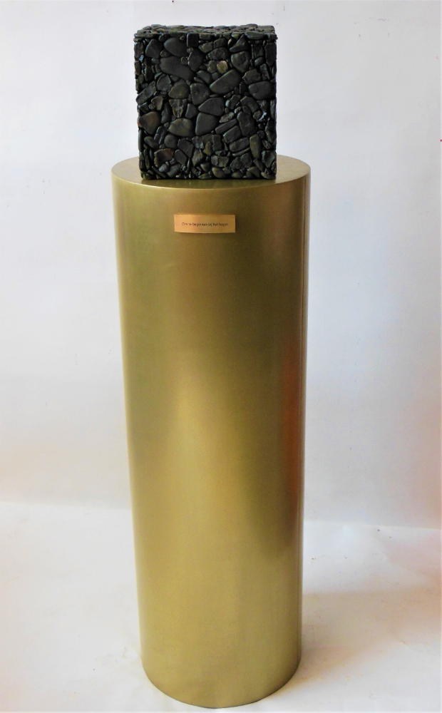 SFEER - TAZ (Tijdelijke Autonome Zone van Harmen Verbrugge) - bruine kiezels, stalen sokkel, H. 144 cm, Ø 29 cm, 2024, € 9.500,- ( incl. 9% BTW )