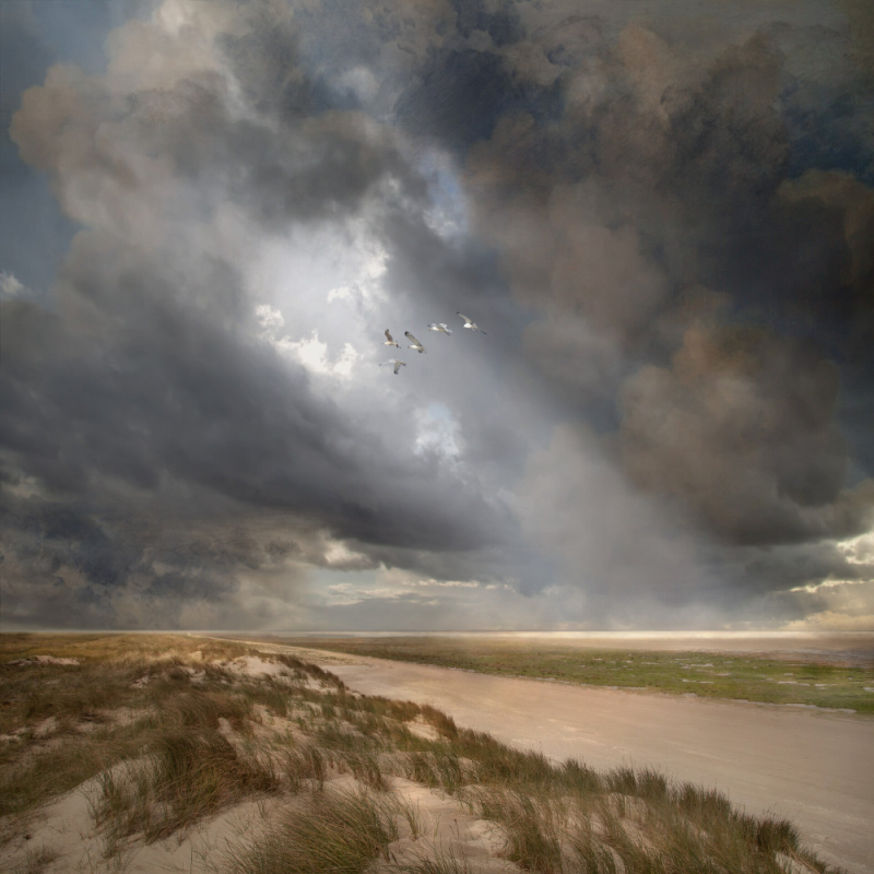 “Enchanted by the same landscapes that inspired Paulus Potter, Van Ruisdael and Willem Maris, Saskia shares a sensibility, as well as her subject matter, with the great Dutch skies, lonely beaches, and impossibly tangled bramble fields reveal a similar sensitivity to space, light and texture, wich she cultivated over years of working as an installation artist. Saskia neatly contains all of her expansive horizons and wild landscapes within the rigorous formal boundaries of the square. The square is pure. The square is modern. The square is the basic unit of The Grid and, as the defining shape of our Instagram age, it is the frame through wich many of us now see and experience the world. Reveling in the constraints imposed by the square, Saskia challenges herself with each work to capture the real (and the magical) within the most rational forms.”